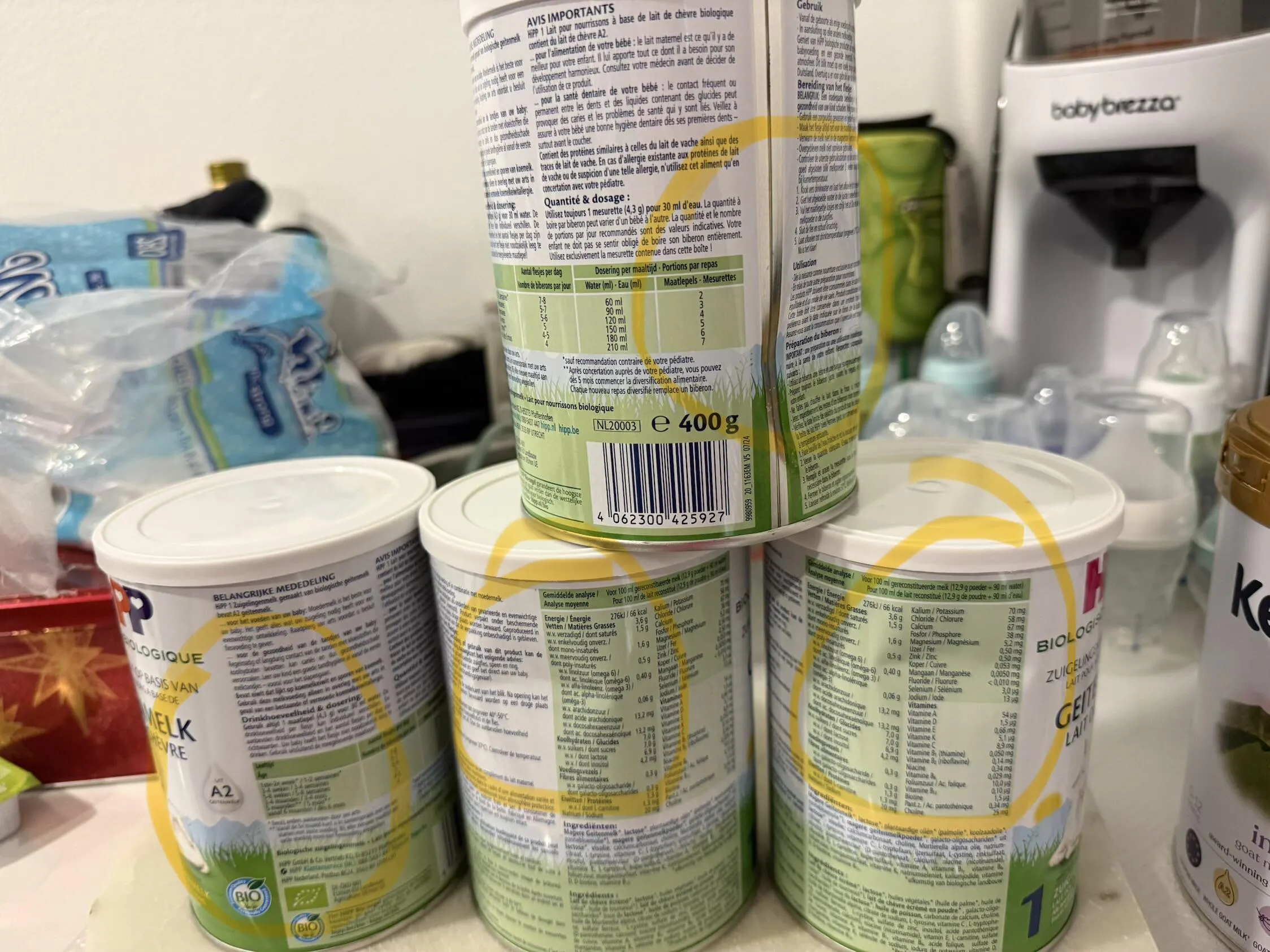 Organic skimmed goat milk, organic lactose, organic vegetable oils (palm oil, rapeseed oil, sunflower oil), organic skimmed goat milk powder, organic galacto-oligosaccharides (GOS) from organic lactose, fish oil (as DHA source), calcium carbonate, choline, Mortierella Alpina oil, sodium citrate, L-tyrosine, vitamin C, L-tryptophan, iron sulfate, L-cystine, zinc sulfate, inositol, pantothenic acid, niacin, vitamin E, L-carnitine, copper sulfate, vitamin A, vitamin B1, vitamin B6, folic acid, manganese sulfate, vitamin K, sodium selenate, potassium iodate, vitamin D, D-biotin, vitamin B12.